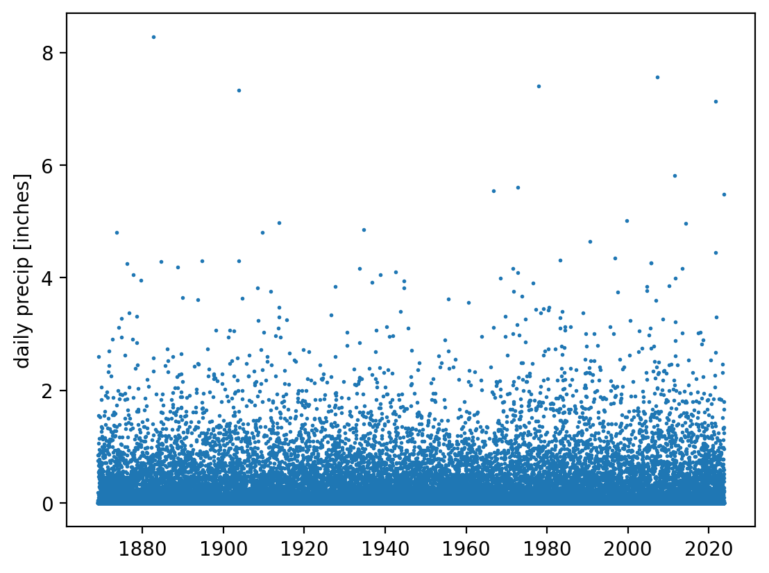 Now let’s look at a more realistic dataset: the actual daily precipitation as measured by the Central Park weather station. This record spans from the year 1869 to today. Does this data “speak for itself”?